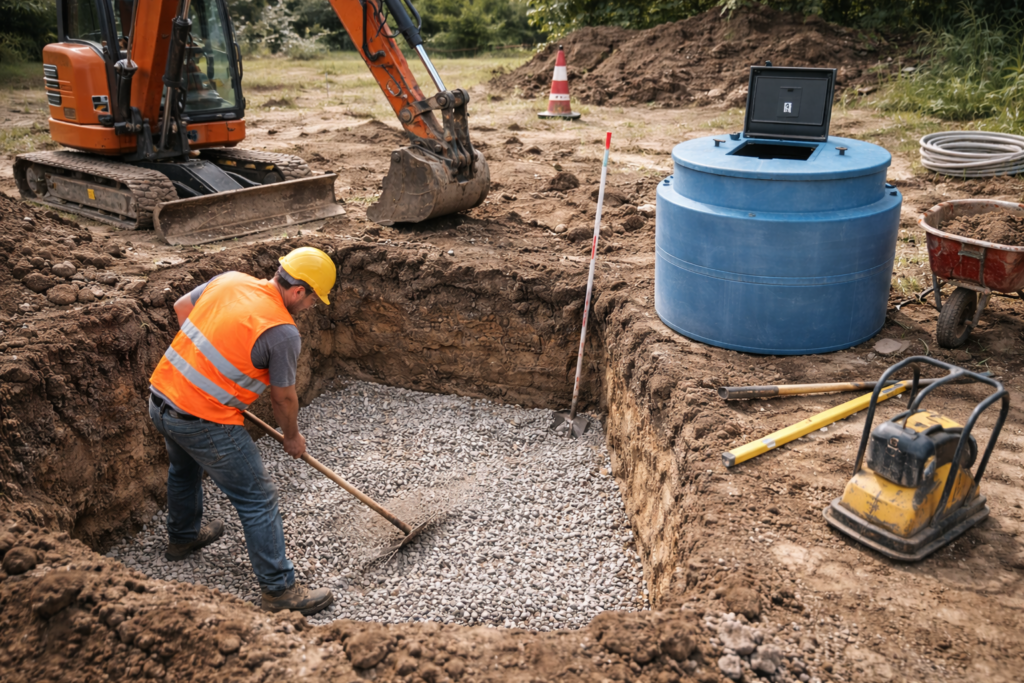 Příprava a stabilizace dna jámy je dalším důležitým krokem. Zhutnění půdy a aplikace stabilizační vrstvy z štěrku nebo betonu zajišťuje, že šachta bude mít pevný a rovný základ. Tato příprava je zásadní pro dlouhodobou stabilitu a funkčnost vodoměrné šachty.