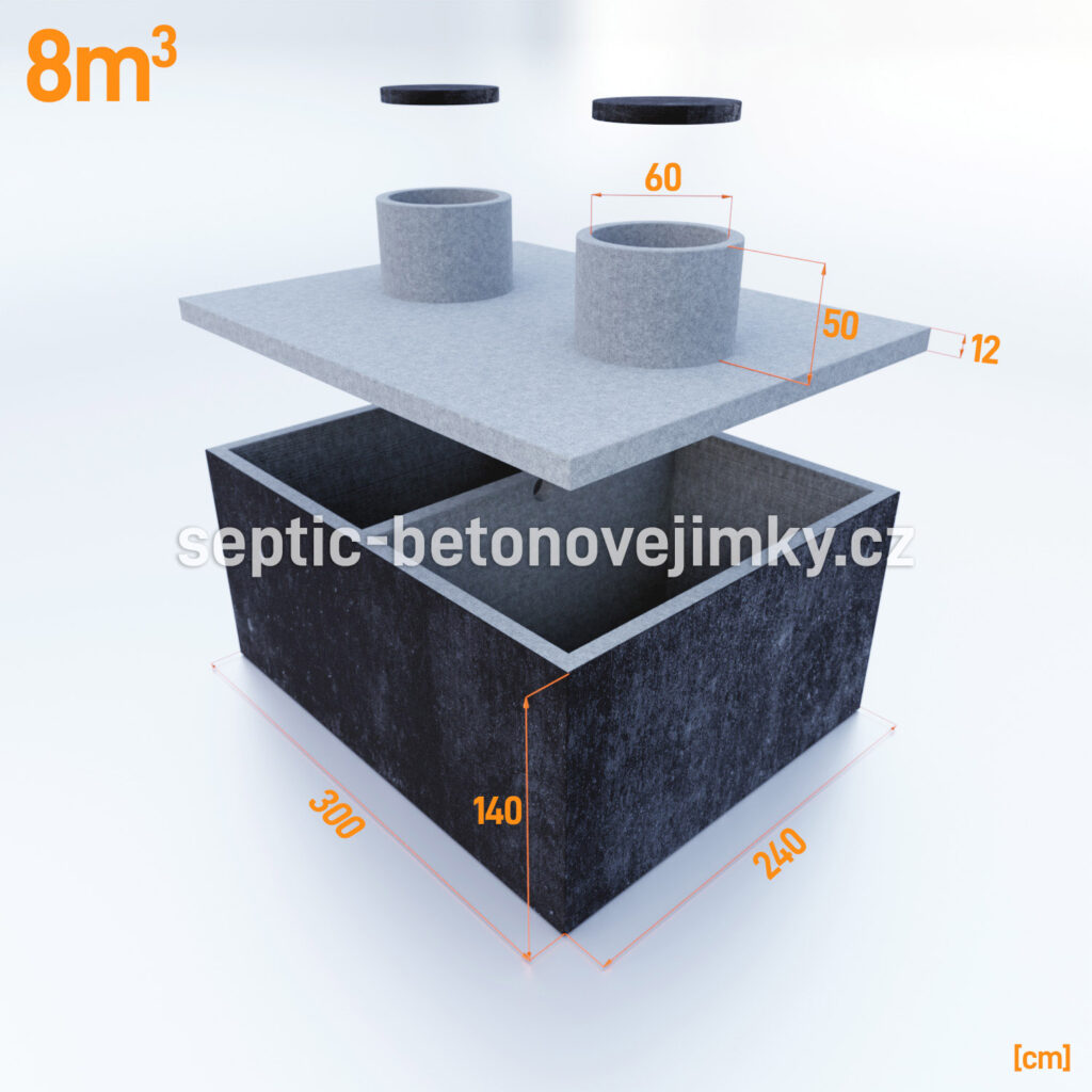 Rozměry dvoukomorové betonové jímky 8 m³ jsou následující: délka 3,00 m, šířka 2,40 m a výška 1,40 m. Pro instalaci jímky je potřeba připravit výkop s rozměry: délka 3,50 m, šířka 2,90 m a výška 1,95 m. Tyto rozměry zajistí správné usazení a stabilitu jímky.