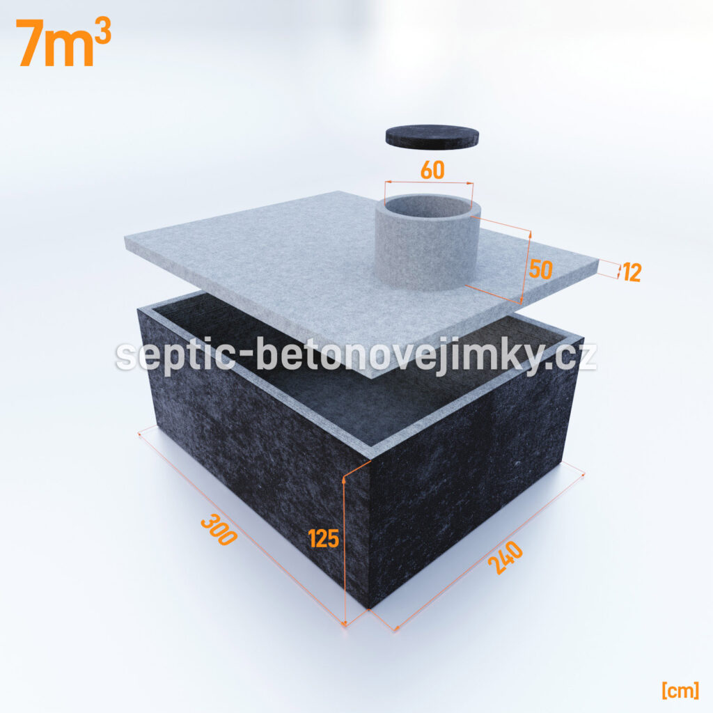 Jednokomorová betonová jímka o objemu 7 m³ má rozměry: délka 3,00 m, šířka 2,40 m a výška 1,25 m. Rozměr výkopu pro tuto jímku by měl být: délka 3,50 m, šířka 2,90 m a výška 1,75 m. Tyto rozměry zajišťují snadnou a efektivní instalaci na místě.