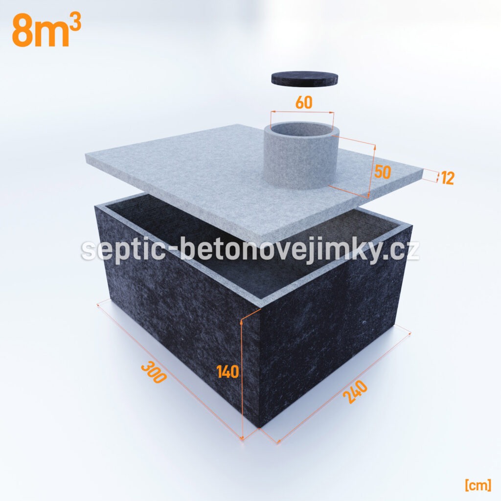 Jednokomorová betonová jímka o objemu 8 m³ má rozměry: délka 3,00 m, šířka 2,40 m a výška 1,40 m. Rozměr výkopu pro tuto jímku by měl být: délka 3,50 m, šířka 3,00 m a výška 2,00 m. Tyto rozměry zajišťují snadnou a efektivní instalaci na místě.